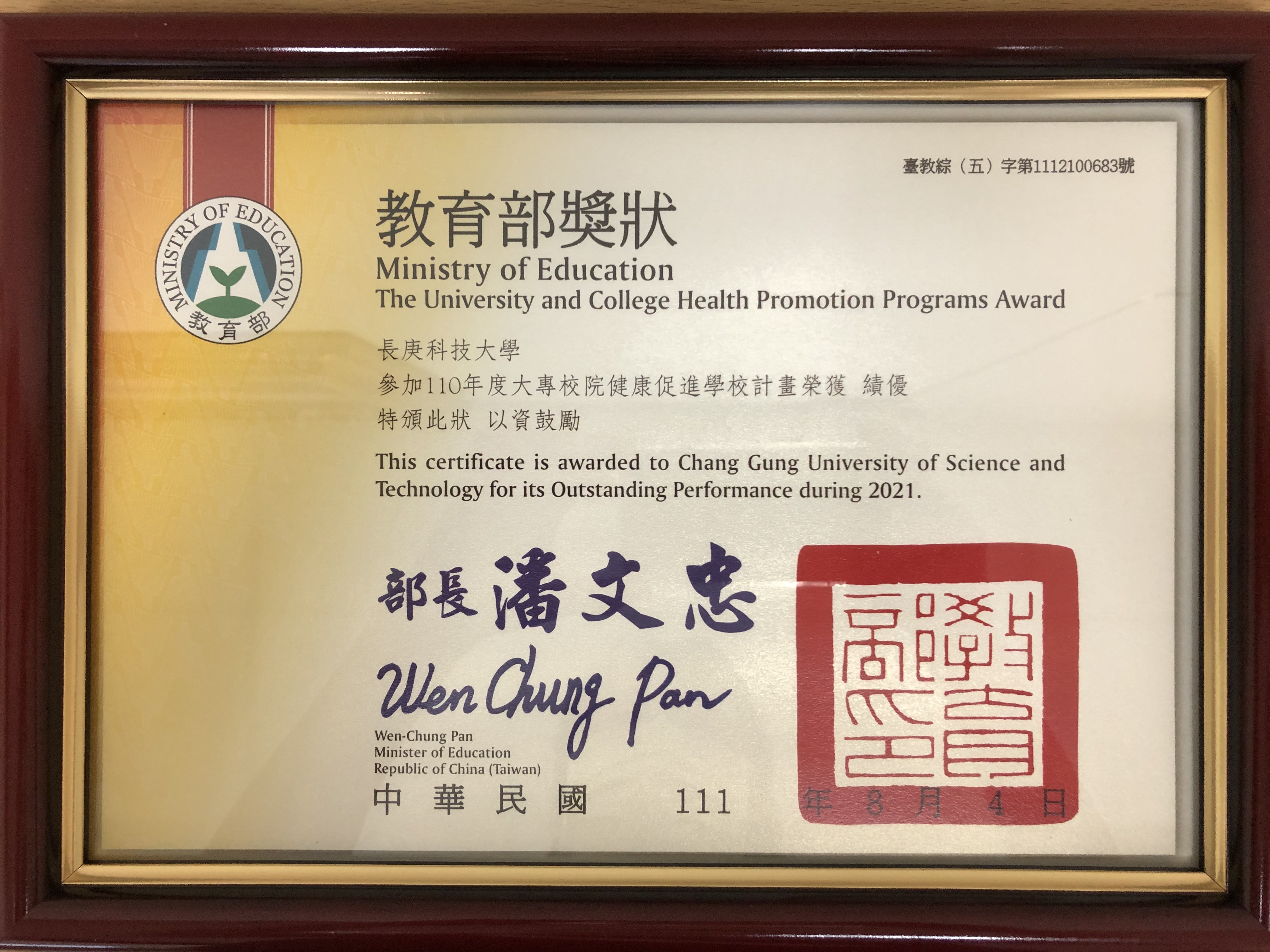 100學年度及102~103年度榮獲健康促進實施學校整體績優、104年度榮獲健康體位議題績優、105年度榮獲健康促進實施學校整體績優,106-108年度榮獲大專校院健康促進計畫績優學校