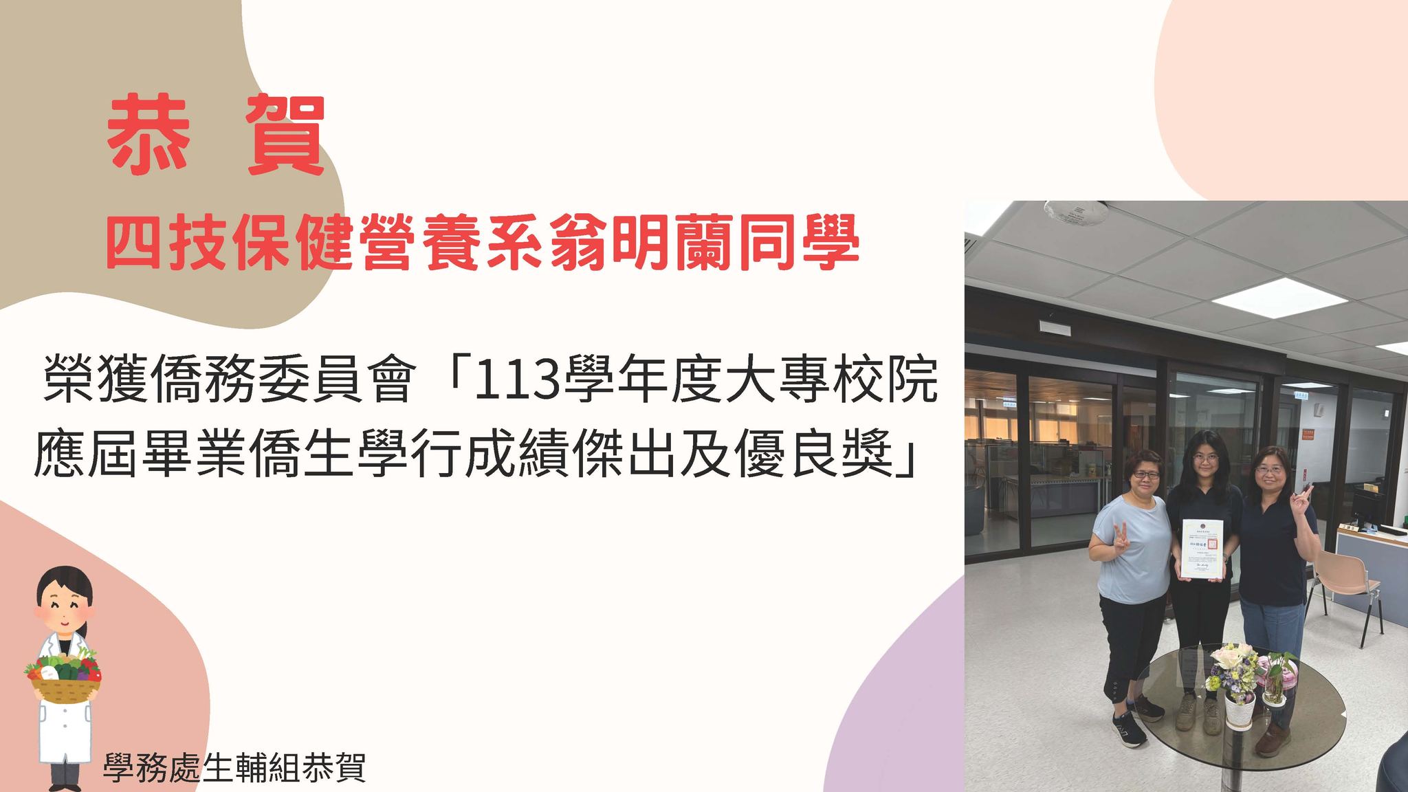 恭賀四技保健營養系翁明蘭同學,榮獲僑務委員會「113學年度大專校院應屆畢業僑生學行成績傑出及優良獎」,長庚科大全校師長與有榮焉。