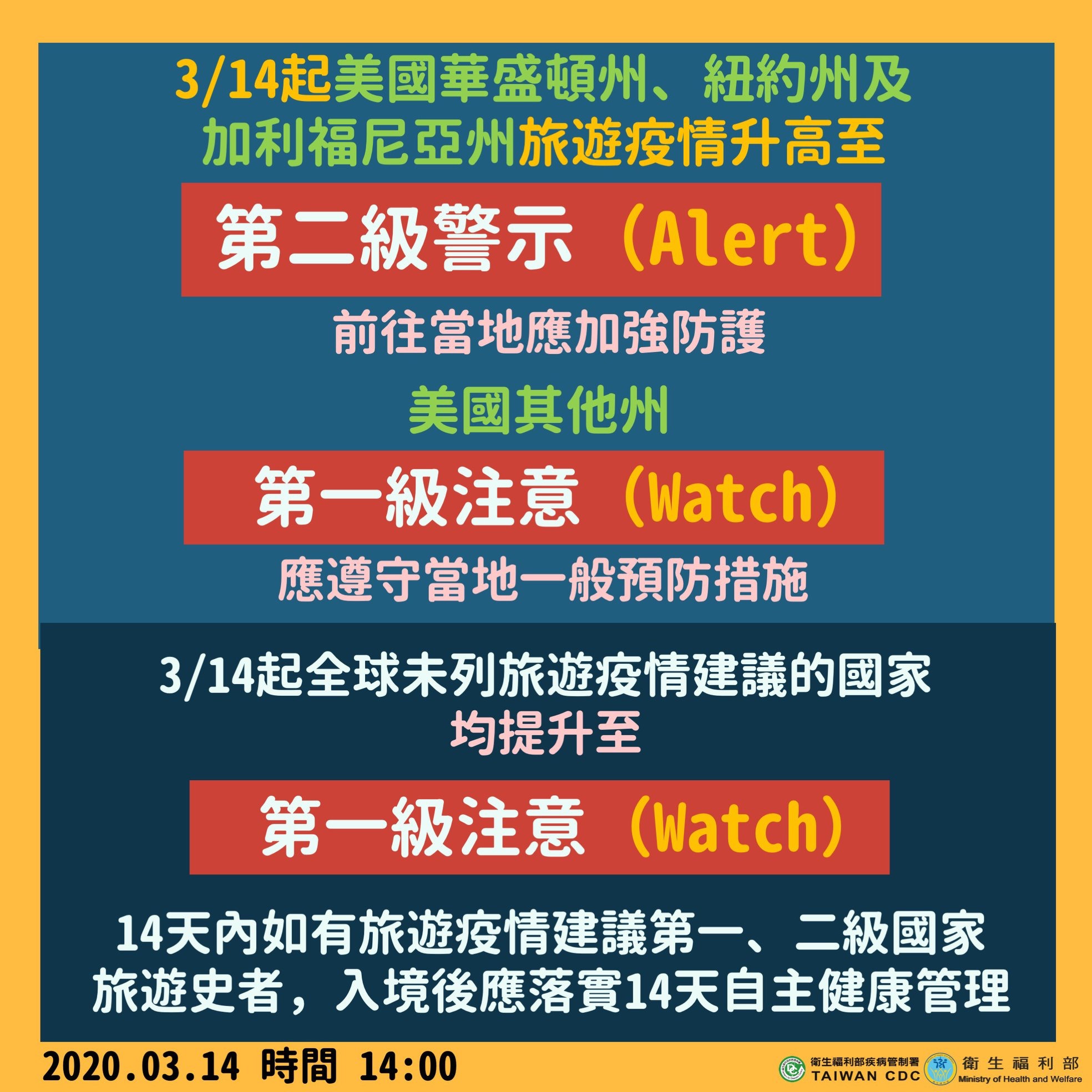 2020.03.14 3月14日起美國華盛頓州、紐約州及加利福尼亞州旅遊疫情升高至第二級警示