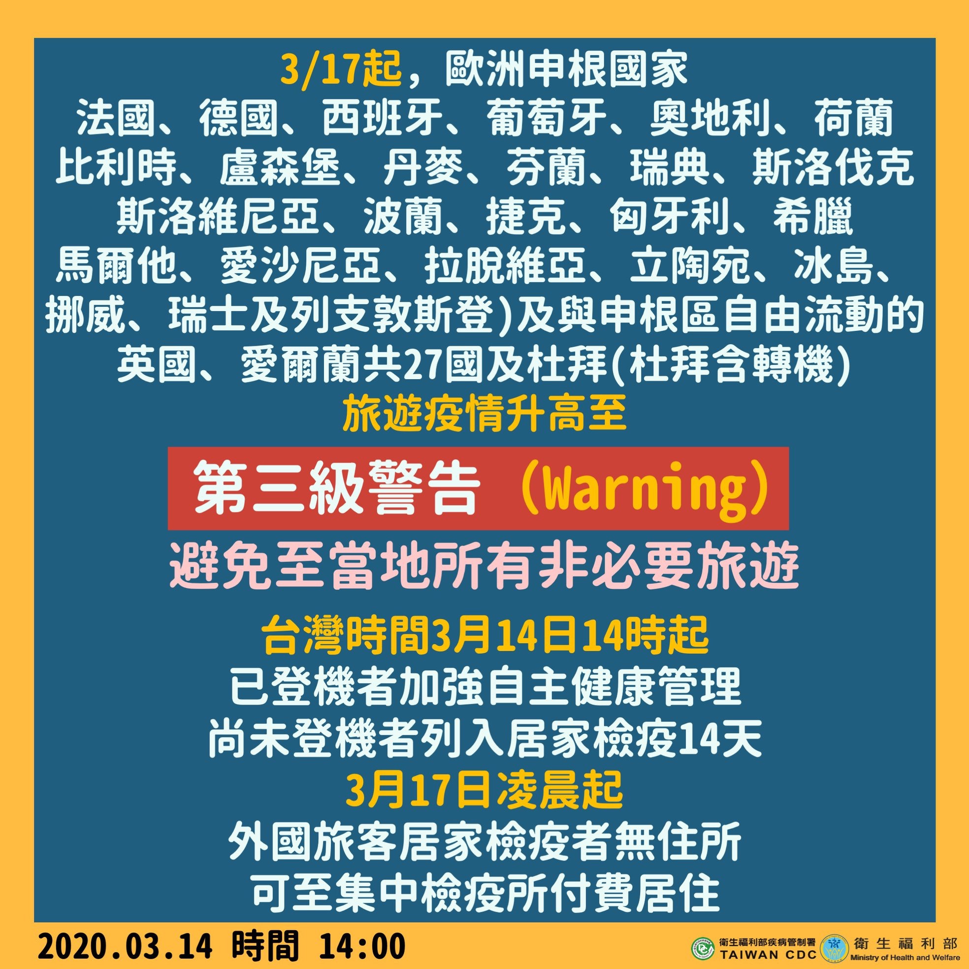 2020.03.14 3月17日起14天內有歐洲27國及杜拜旅遊史入境須居家檢疫14天