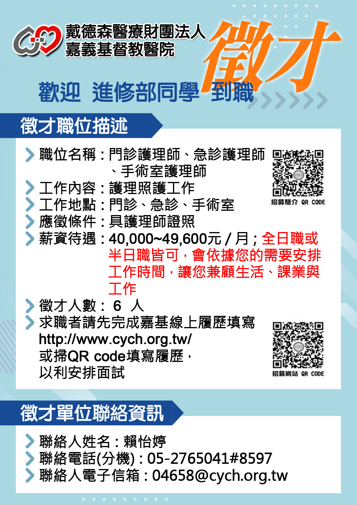 嘉義基督教醫院徵門診/急診/手術室護理師