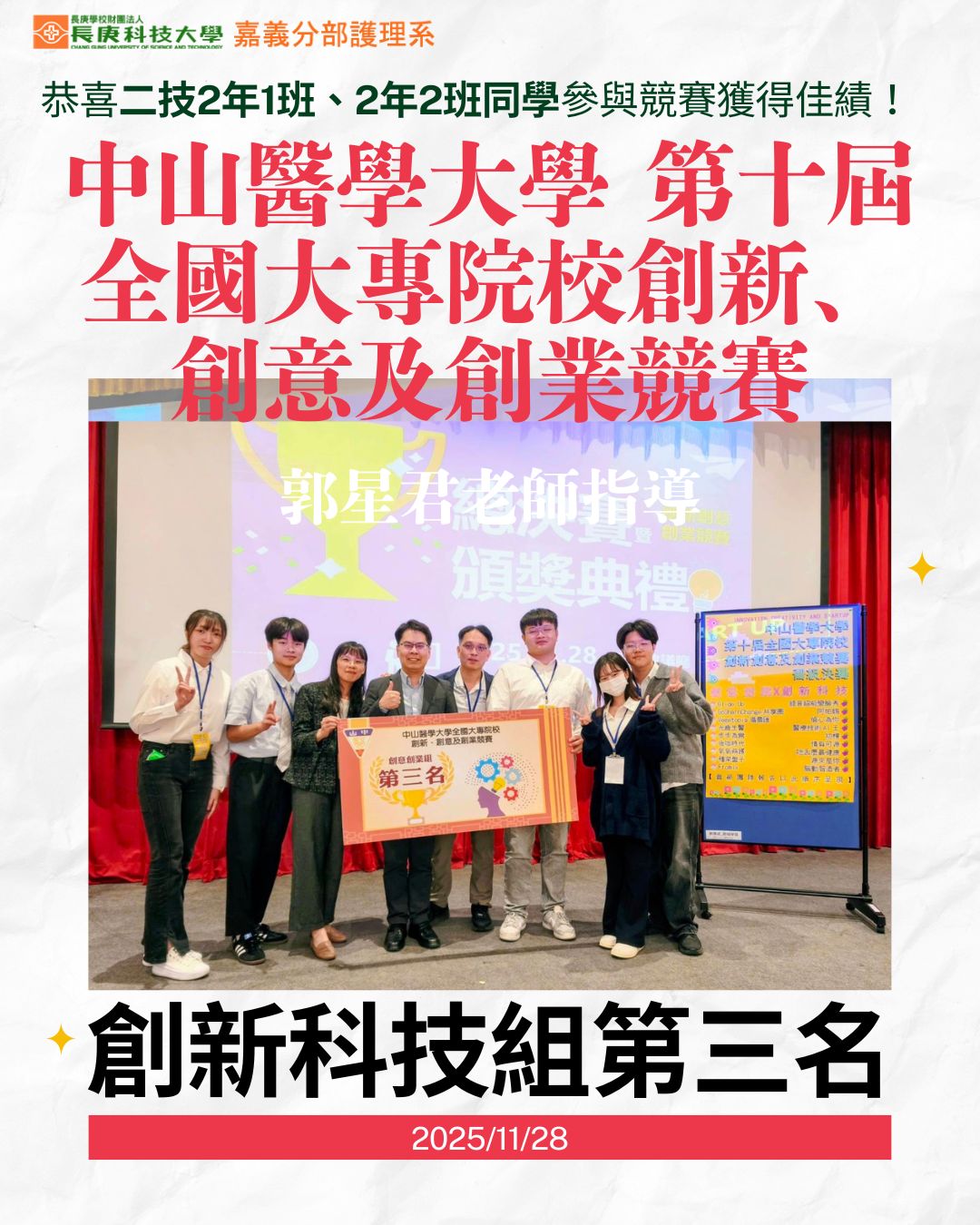 【嘉義護理系】本系郭星君老師指導學生參加中山醫學大學第十屆全國大專院校創新、創意及創業競賽榮獲創新科技組第三名,表現卓越,勇奪創新科技組第三名!